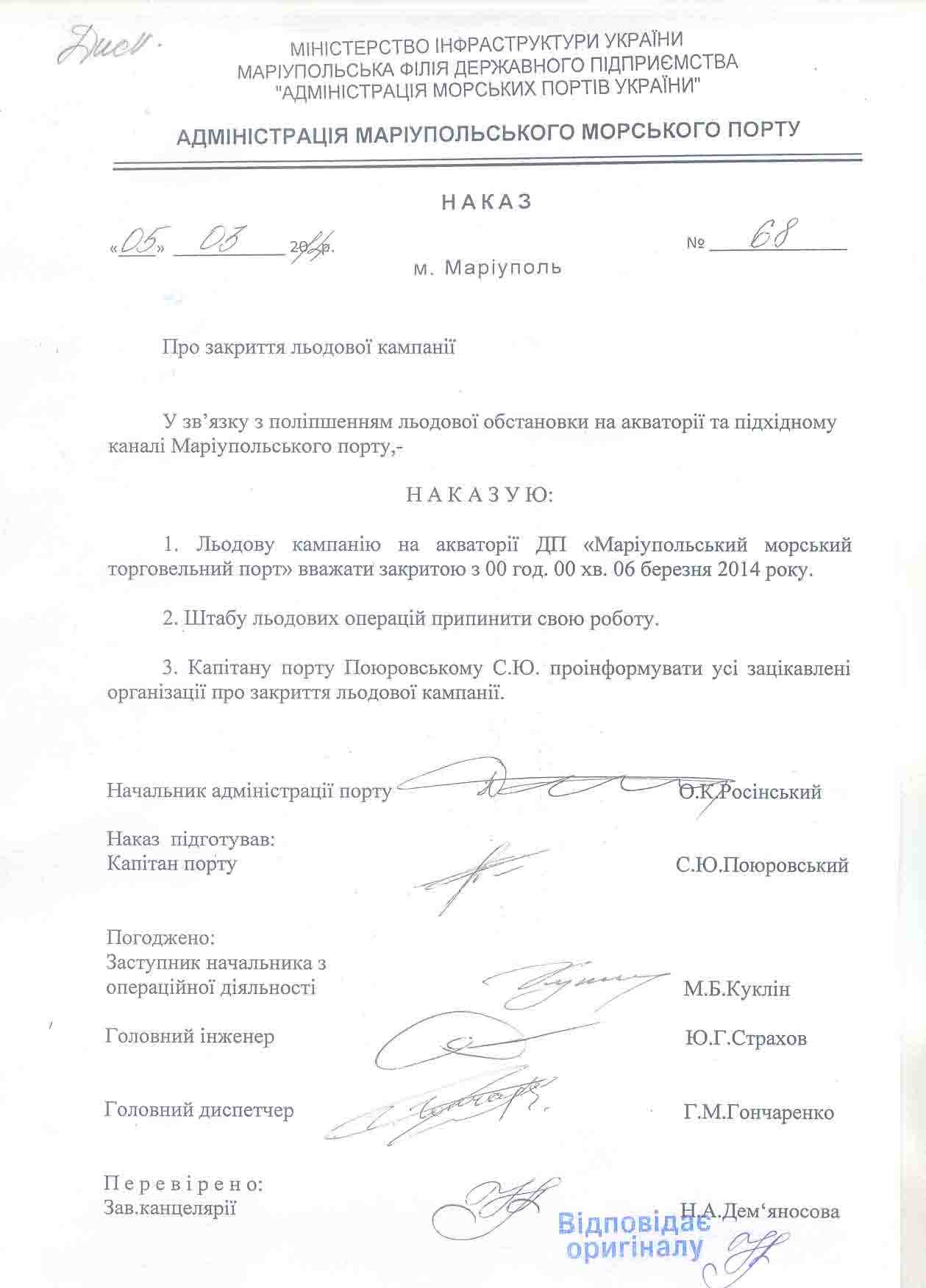 Согласно приказу № 68 от 05.03.2014 администрации Мариупольского морского торгового порта ледовая кампания 2014 г. в порту Мариуполь закрыта в 0:00 06.03.2014.